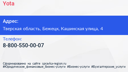 Yota по адресу Тверская область, Бежецк, Кашинская улица, 4 в дальнейшем Организация, размещена в следующих категориях:
