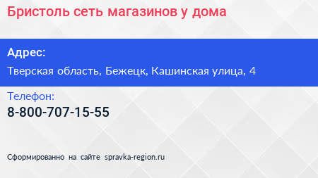 Бристоль, сеть магазинов у дома по адресу Тверская область, Бежецк, Кашинская улица, 4 в дальнейшем Организация, размещена в следующих категориях: