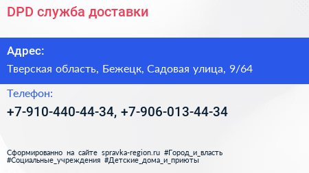DPD, служба доставки по адресу Тверская область, Бежецк, Садовая улица, 9/64 в дальнейшем Организация, размещена в следующих категориях: