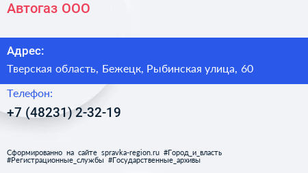 Автогаз , ООО по адресу Тверская область, Бежецк, Рыбинская улица, 60 в дальнейшем Организация, размещена в следующих категориях: