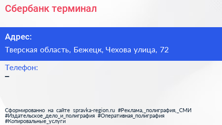 Сбербанк, терминал по адресу Тверская область, Бежецк, Чехова улица, 72 в дальнейшем Организация, размещена в следующих категориях: