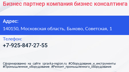 Бизнес партнер, компания бизнес-консалтинга по адресу 140150, Московская область, Быково, Советская, 1 в дальнейшем Организация, размещена в следующих категориях: