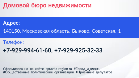 Домовой, бюро недвижимости по адресу 140150, Московская область, Быково, Советская, 1 в дальнейшем Организация, размещена в следующих категориях: