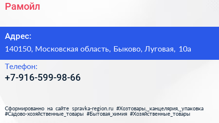 Рамойл по адресу 140150, Московская область, Быково, Луговая, 10а в дальнейшем Организация, размещена в следующих категориях: