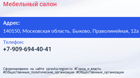 Мебельный салон по адресу 140150, Московская область, Быково, Праволинейная, 12а в дальнейшем Организация, размещена в следующих категориях: