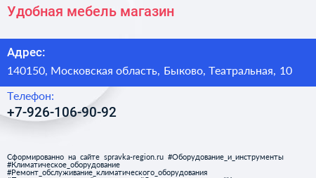 Удобная мебель, магазин по адресу 140150, Московская область, Быково, Театральная, 10 в дальнейшем Организация, размещена в следующих категориях: