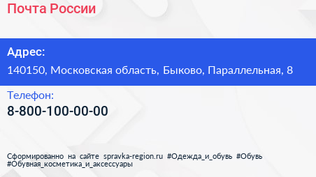 Почта России по адресу 140150, Московская область, Быково, Параллельная, 8 в дальнейшем Организация, размещена в следующих категориях:
