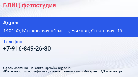 БЛИЦ, фотостудия по адресу 140150, Московская область, Быково, Советская, 19 в дальнейшем Организация, размещена в следующих категориях: