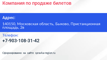 Компания по продаже билетов по адресу 140150, Московская область, Быково, Пристанционная площадь, 2в в дальнейшем Организация, размещена в следующих категориях:
