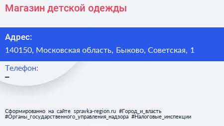 Магазин детской одежды по адресу 140150, Московская область, Быково, Советская, 1 в дальнейшем Организация, размещена в следующих категориях: