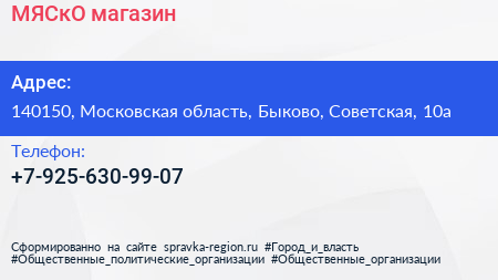 МЯСкО, магазин по адресу 140150, Московская область, Быково, Советская, 10а в дальнейшем Организация, размещена в следующих категориях: