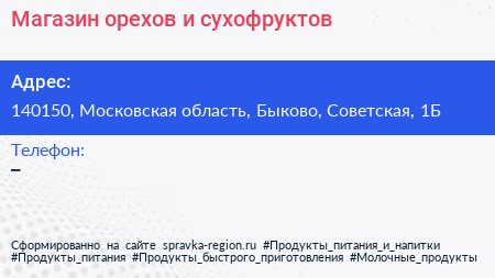 Магазин орехов и сухофруктов по адресу 140150, Московская область, Быково, Советская, 1Б в дальнейшем Организация, размещена в следующих категориях: