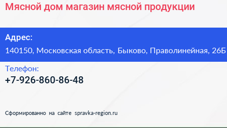 Мясной дом, магазин мясной продукции по адресу 140150, Московская область, Быково, Праволинейная, 26Б в дальнейшем Организация, размещена в следующих категориях: