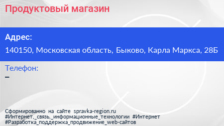 Продуктовый магазин по адресу 140150, Московская область, Быково, Карла Маркса, 28Б в дальнейшем Организация, размещена в следующих категориях: