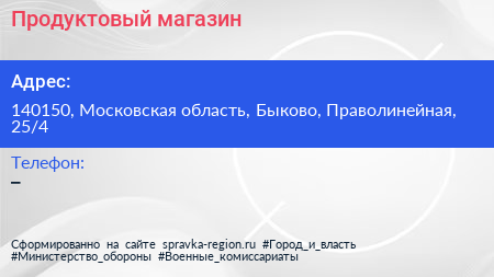 Продуктовый магазин по адресу 140150, Московская область, Быково, Праволинейная, 25/4 в дальнейшем Организация, размещена в следующих категориях: