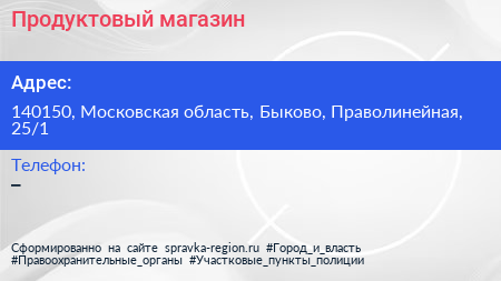 Продуктовый магазин по адресу 140150, Московская область, Быково, Праволинейная, 25/1 в дальнейшем Организация, размещена в следующих категориях: