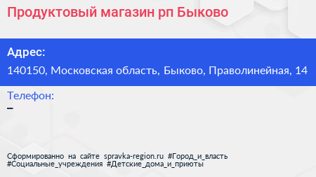 Продуктовый магазин, рп. Быково по адресу 140150, Московская область, Быково, Праволинейная, 14 в дальнейшем Организация, размещена в следующих категориях: