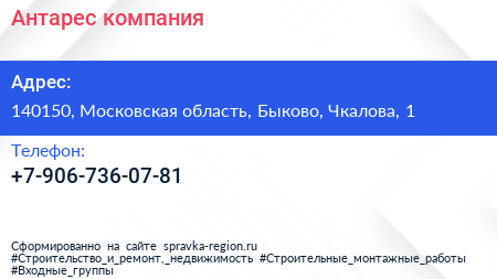 Антарес, компания по адресу 140150, Московская область, Быково, Чкалова, 1 в дальнейшем Организация, размещена в следующих категориях: