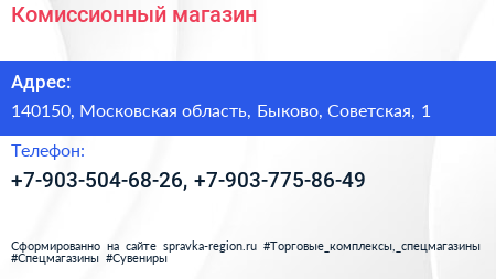 Комиссионный магазин по адресу 140150, Московская область, Быково, Советская, 1 в дальнейшем Организация, размещена в следующих категориях: