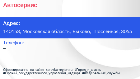Автосервис по адресу 140153, Московская область, Быково, Шоссейная, 305а в дальнейшем Организация, размещена в следующих категориях: