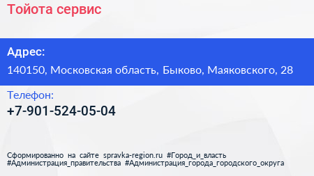 Тойота-сервис по адресу 140150, Московская область, Быково, Маяковского, 28 в дальнейшем Организация, размещена в следующих категориях: