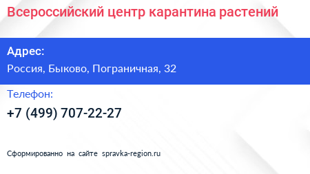 Всероссийский центр карантина растений по адресу Всероссийский центр карантина растений, 32, Пограничная улица, Апариха, Раменский городской округ, Московская область, Центральный федеральный округ, 140150, Россия в дальнейшем Организация, размещена в следующих категориях: