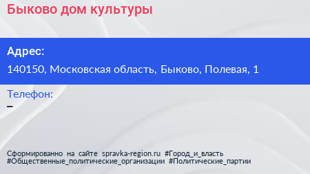 Быково, дом культуры по адресу 140150, Московская область, Быково, Полевая, 1 в дальнейшем Организация, размещена в следующих категориях: