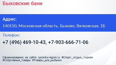 Быковские бани по адресу 140150, Московская область, Быково, Вялковская, 1Б в дальнейшем Организация, размещена в следующих категориях: