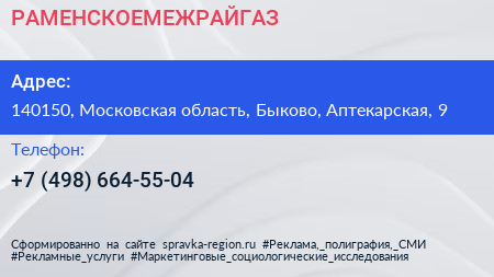 РАМЕНСКОЕМЕЖРАЙГАЗ по адресу 140150, Московская область, Быково, Аптекарская, 9 в дальнейшем Организация, размещена в следующих категориях: