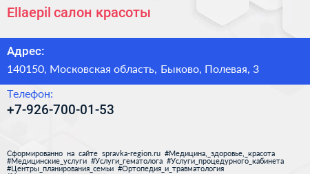 Ellaepil, салон красоты по адресу 140150, Московская область, Быково, Полевая, 3 в дальнейшем Организация, размещена в следующих категориях: