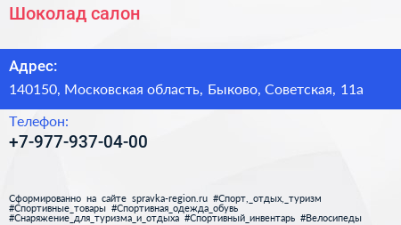 Шоколад, салон по адресу 140150, Московская область, Быково, Советская, 11а в дальнейшем Организация, размещена в следующих категориях: