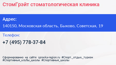 СтомГрэйт, стоматологическая клиника по адресу 140150, Московская область, Быково, Советская, 19 в дальнейшем Организация, размещена в следующих категориях: