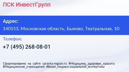 ПСК ИнвестГрупп по адресу 140153, Московская область, Быково, Театральная, 10 в дальнейшем Организация, размещена в следующих категориях: