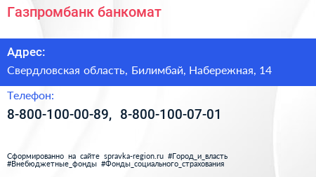 Газпромбанк, банкомат по адресу Свердловская область, Билимбай, Набережная, 14 в дальнейшем Организация, размещена в следующих категориях: