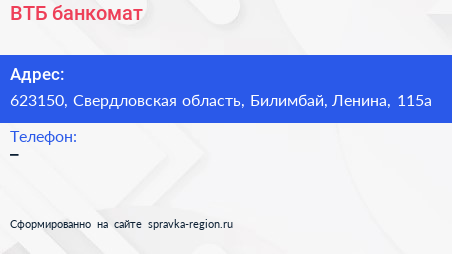 ВТБ, банкомат по адресу 623150, Свердловская область, Билимбай, Ленина, 115а в дальнейшем Организация, размещена в следующих категориях: