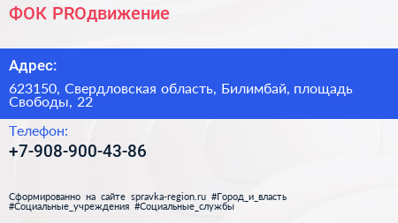ФОК PROдвижение по адресу 623150, Свердловская область, Билимбай, площадь Свободы, 22 в дальнейшем Организация, размещена в следующих категориях: