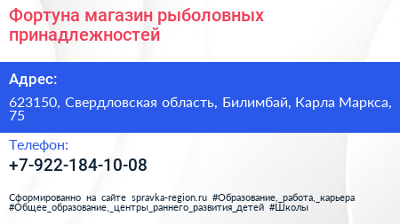 Фортуна, магазин рыболовных принадлежностей по адресу 623150, Свердловская область, Билимбай, Карла Маркса, 75 в дальнейшем Организация, размещена в следующих категориях: