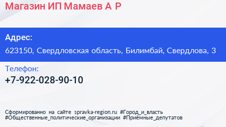 Магазин, ИП Мамаев А.Р. по адресу 623150, Свердловская область, Билимбай, Свердлова, 3 в дальнейшем Организация, размещена в следующих категориях: