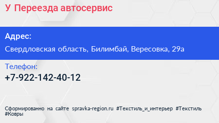 У Переезда, автосервис по адресу Свердловская область, Билимбай, Вересовка, 29а в дальнейшем Организация, размещена в следующих категориях: