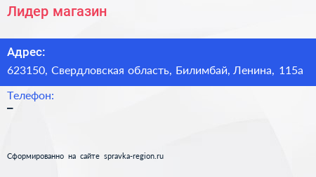 Лидер, магазин по адресу 623150, Свердловская область, Билимбай, Ленина, 115а в дальнейшем Организация, размещена в следующих категориях: