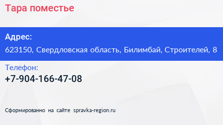 Тара, поместье по адресу 623150, Свердловская область, Билимбай, Строителей, 8 в дальнейшем Организация, размещена в следующих категориях: