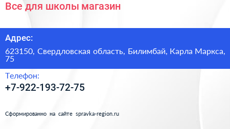 Все для школы, магазин по адресу 623150, Свердловская область, Билимбай, Карла Маркса, 75 в дальнейшем Организация, размещена в следующих категориях: