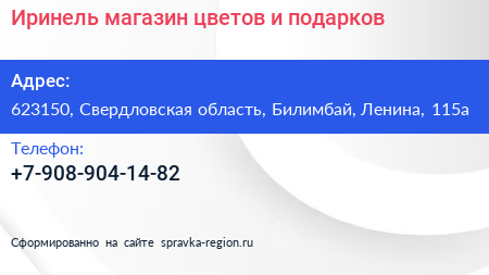 Иринель, магазин цветов и подарков по адресу 623150, Свердловская область, Билимбай, Ленина, 115а в дальнейшем Организация, размещена в следующих категориях: