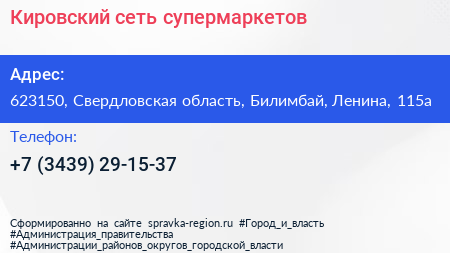 Кировский, сеть супермаркетов по адресу 623150, Свердловская область, Билимбай, Ленина, 115а в дальнейшем Организация, размещена в следующих категориях: