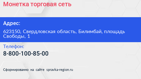 Монетка, торговая сеть по адресу 623150, Свердловская область, Билимбай, площадь Свободы, 1 в дальнейшем Организация, размещена в следующих категориях: