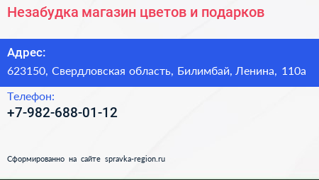 Незабудка, магазин цветов и подарков по адресу 623150, Свердловская область, Билимбай, Ленина, 110а в дальнейшем Организация, размещена в следующих категориях: