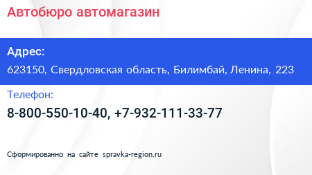 Автобюро, автомагазин по адресу 623150, Свердловская область, Билимбай, Ленина, 223 в дальнейшем Организация, размещена в следующих категориях: