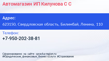 Автомагазин, ИП Килунова С.С. по адресу 623150, Свердловская область, Билимбай, Ленина, 110 в дальнейшем Организация, размещена в следующих категориях: