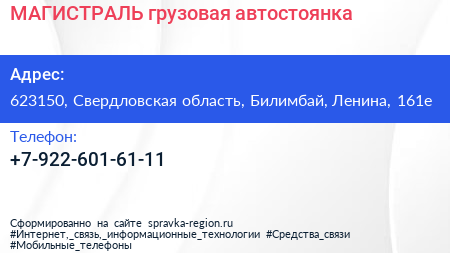МАГИСТРАЛЬ, грузовая автостоянка по адресу 623150, Свердловская область, Билимбай, Ленина, 161е в дальнейшем Организация, размещена в следующих категориях: