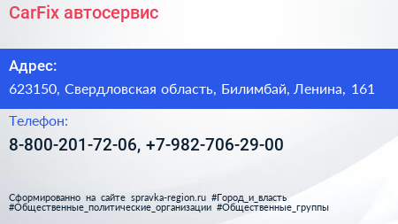 CarFix, автосервис по адресу 623150, Свердловская область, Билимбай, Ленина, 161 в дальнейшем Организация, размещена в следующих категориях:
